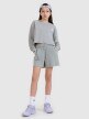 Po bokach znajdują się 2 kieszenie otwarte, które pomieszczą drobne akcesoria, np. klucze czy małą butelkę wody. Elastyczny pas bez regulacji zapewnia jednolitą linię w talii, a prosty fason bez dodatkowych ściągaczy podkreśla minimalistyczny charakter. Szare spodenki dresowe dziewczęce 4F łączą styl, wygodę i praktyczność w jednym.